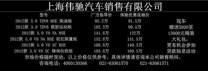 揽胜运动版现金优惠28.5万元 有充足现车 有句话说:开宝马、坐奔驰,而揽胜运动版是这两者相宜的综合体。编辑了解到,上海伟驰汽车有揽胜运动版现车在售,并且这款车子已经出现了较大幅度的让利,优惠28.5万元详情请看下表:
